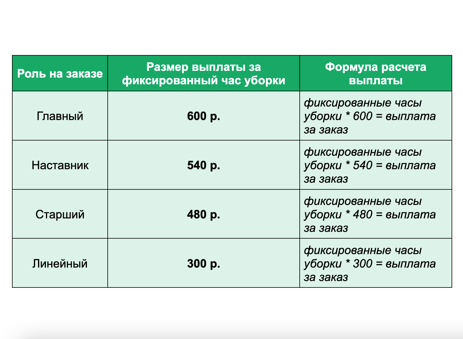 Для каждой роли предусмотрен свой размер выплат за фиксированный час уборки