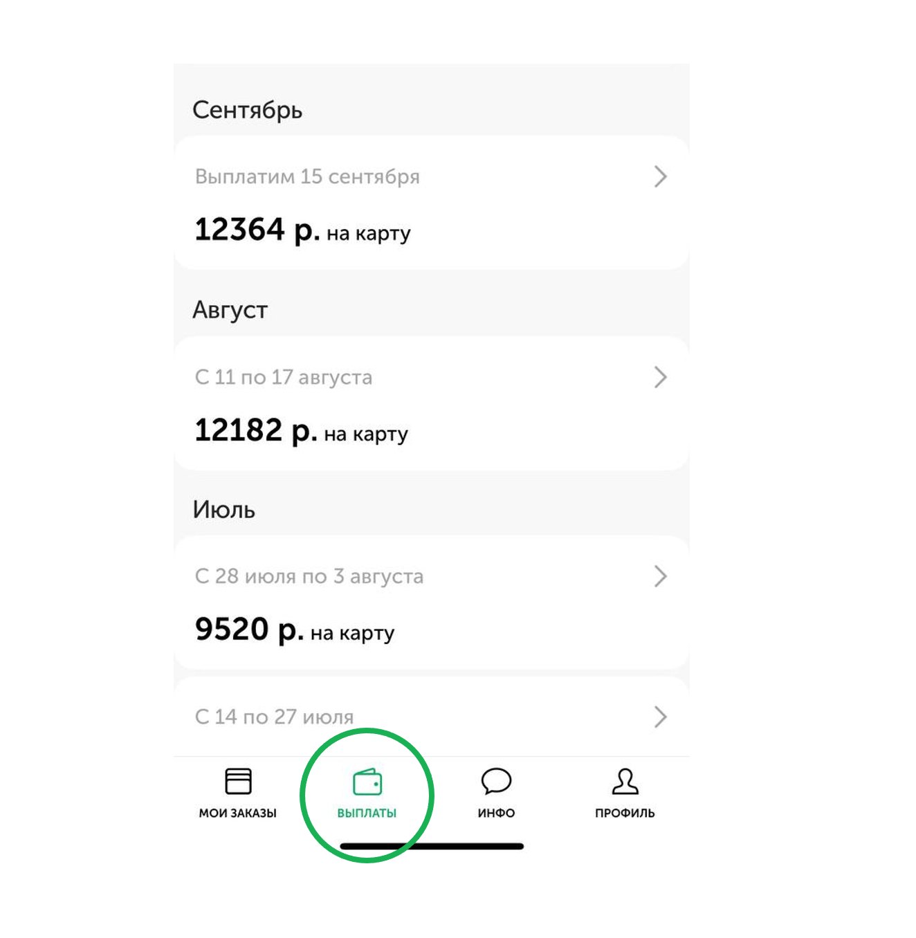 Вкладка «Выплаты» находится в нижнем ряду экрана по центру. Сверху вкладки находится название текущего месяца, под ним карточки.